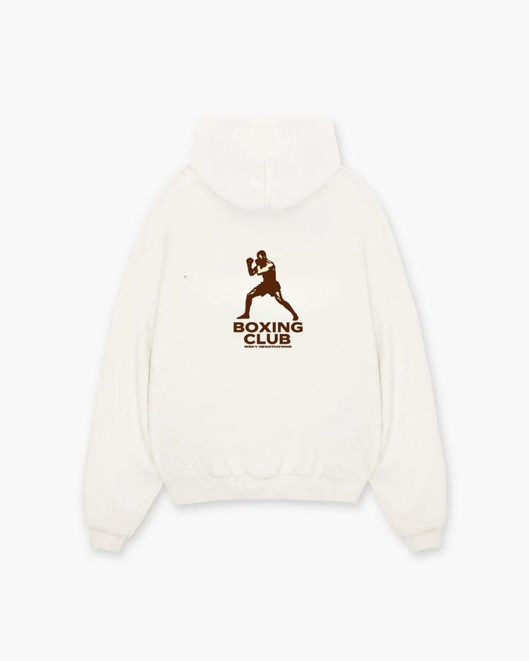 Cream hoodie with an oversized fit crafted from a heavy weight jersey cotton. Super soft, Ribbed hem & cuffs. This brown hoodie features our Boxing Club print to the back.